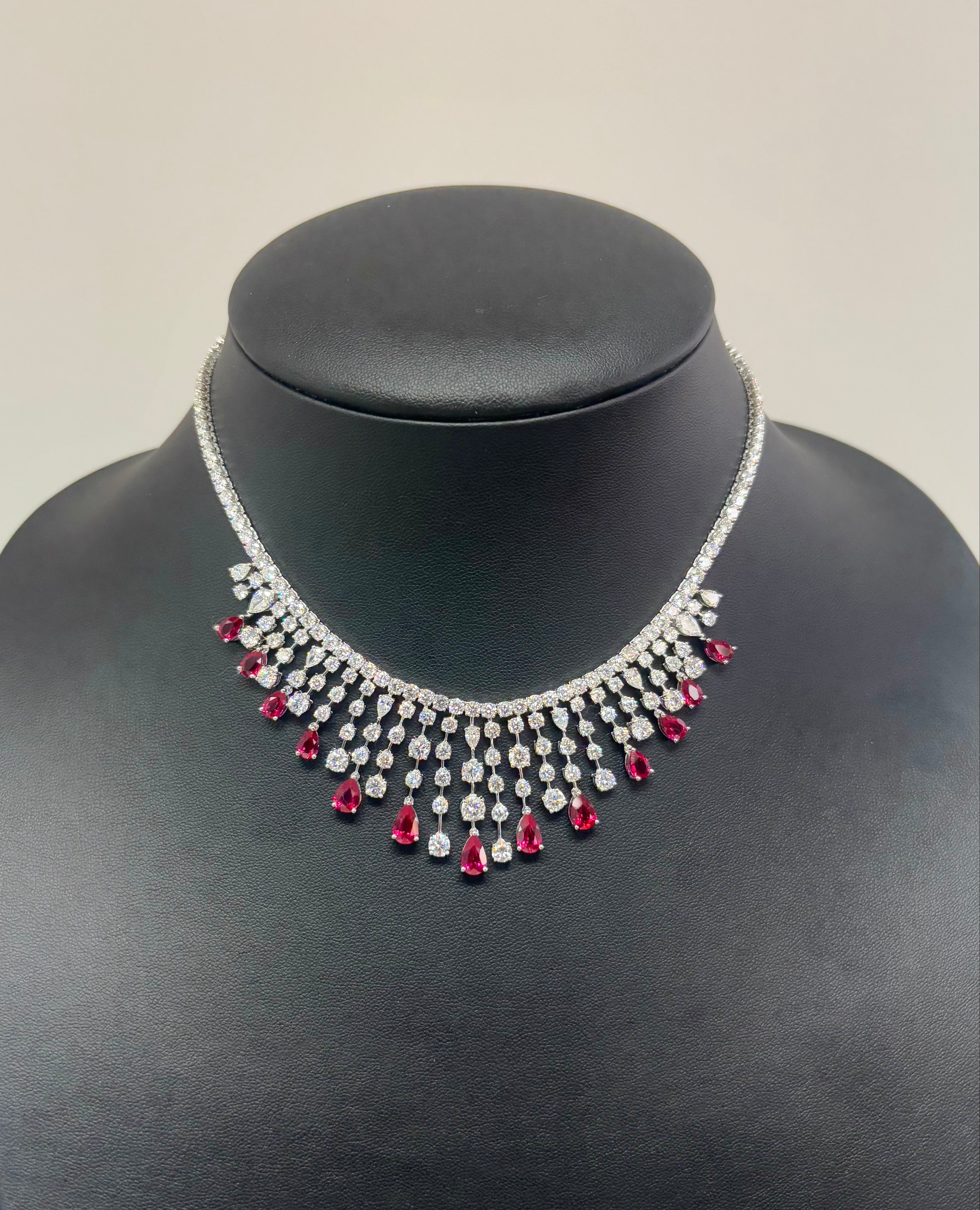 35 Carats Imperial Teardrop Ruby and Round Diamond (LGD) Statement Necklace in 14k White Gold
