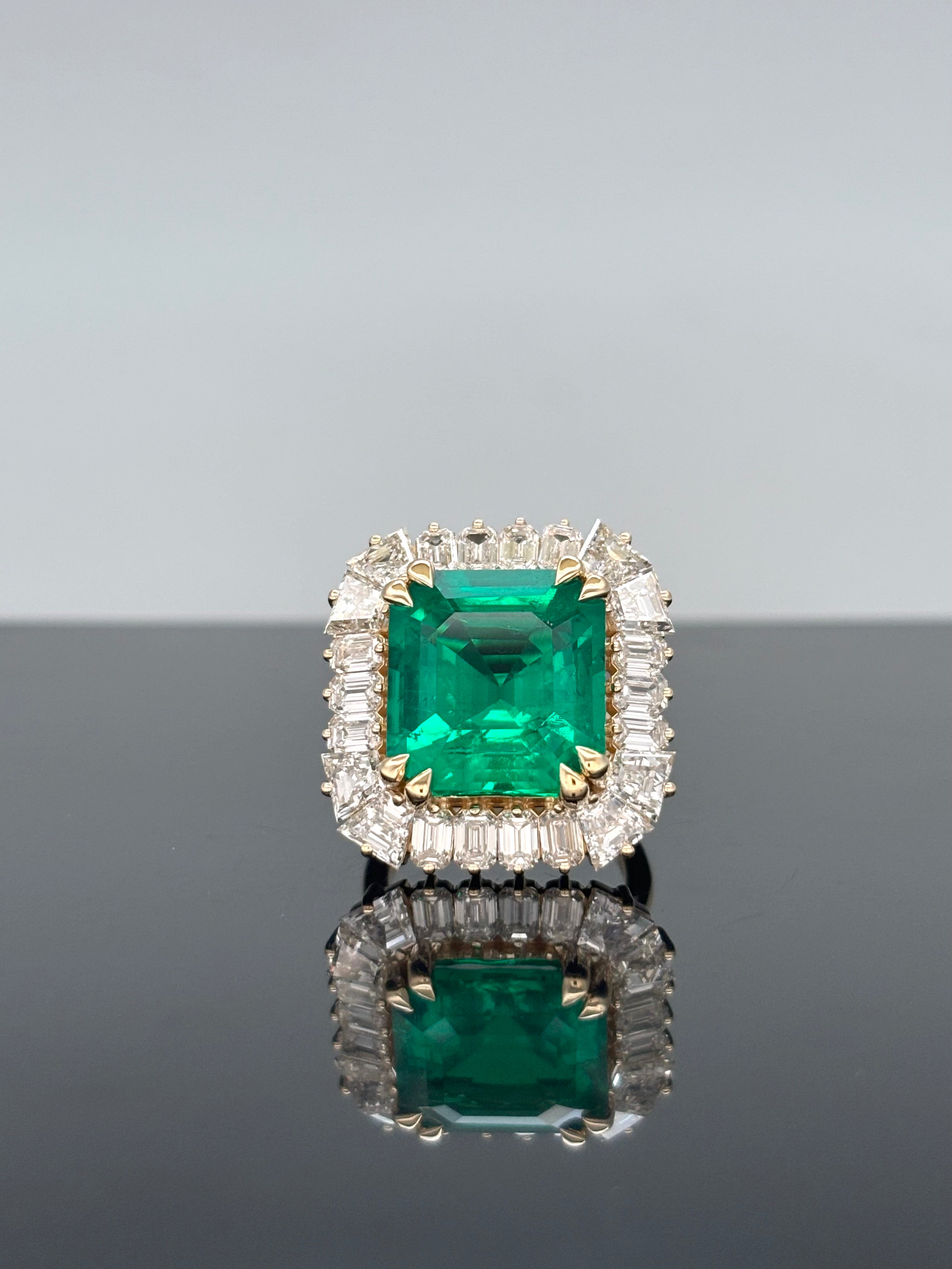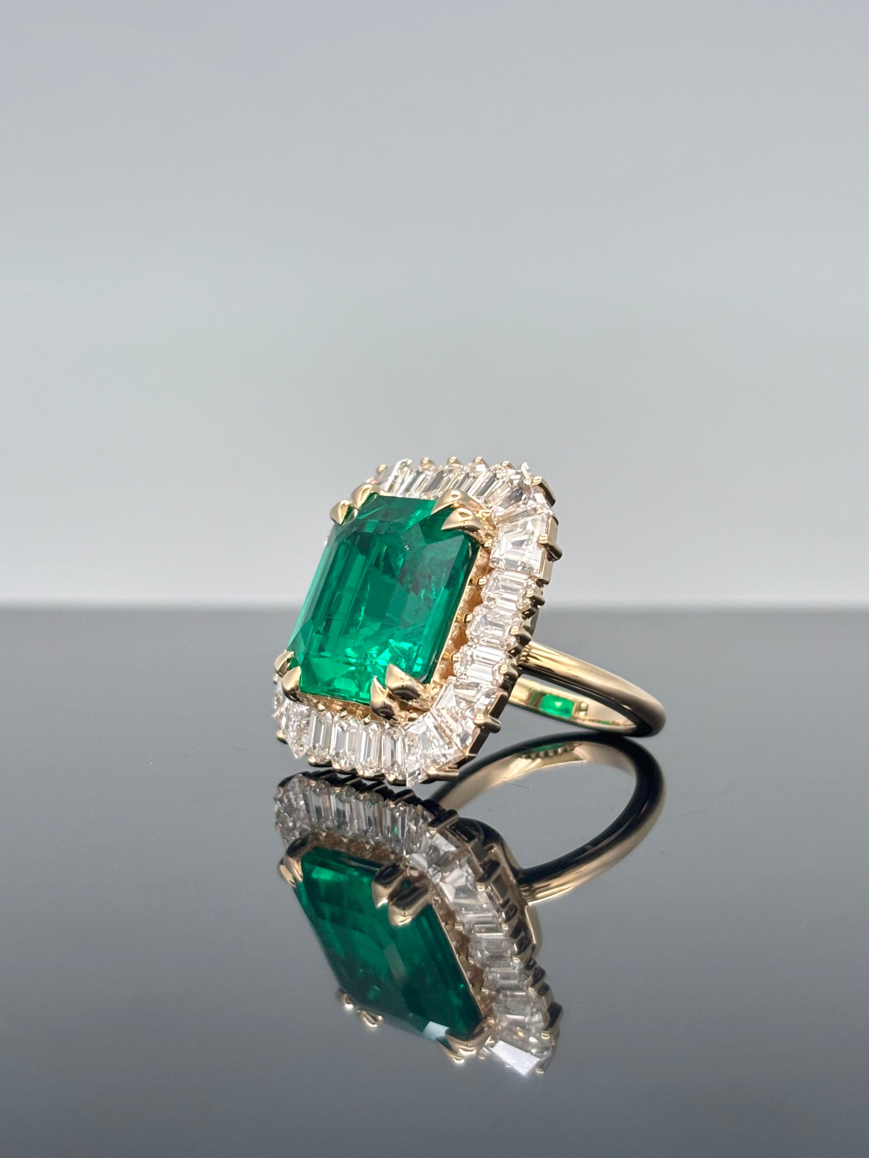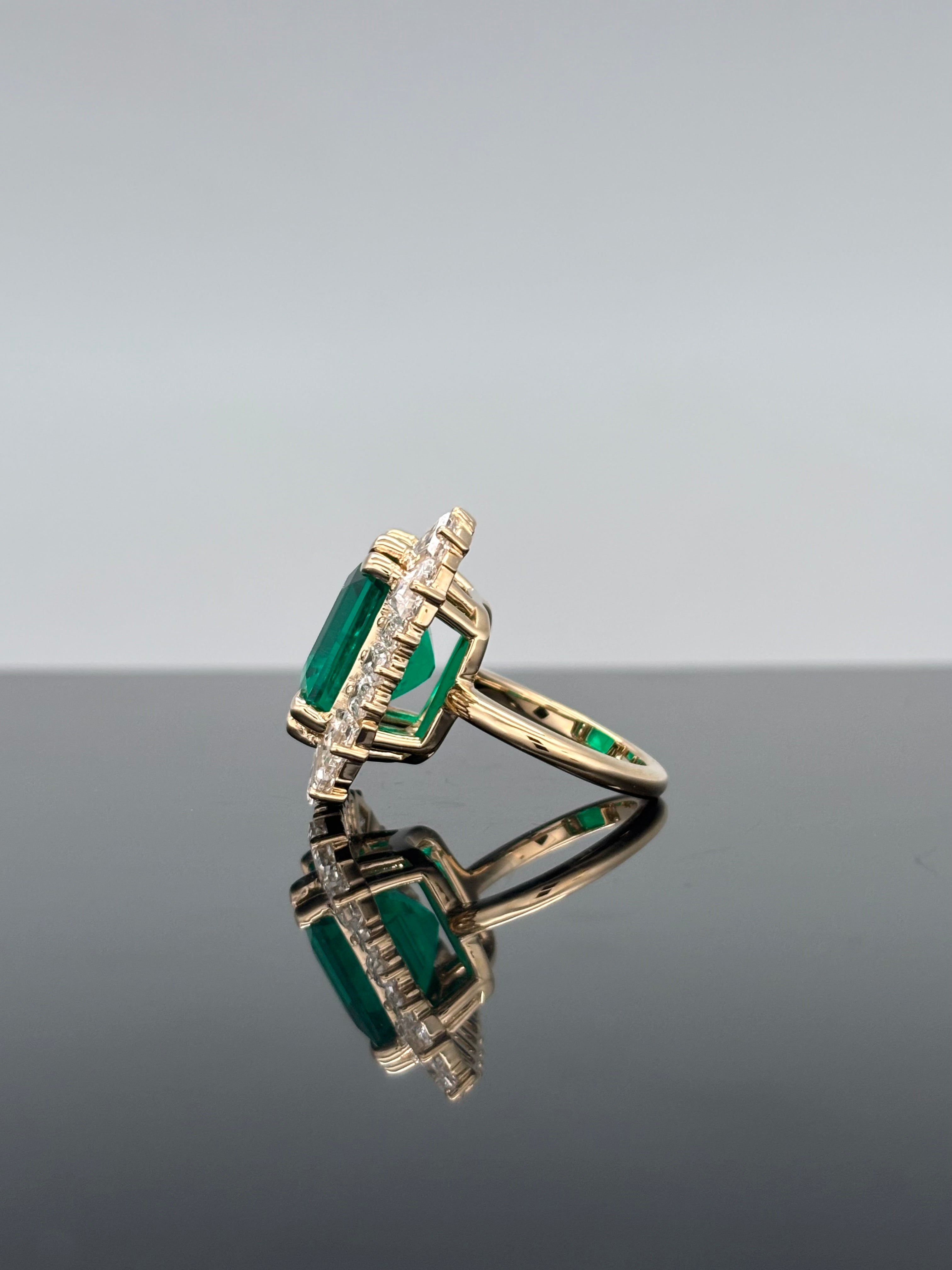 19.92 Carats Classic Lab-Grown Green Emerald with Baguette Diamond Halo Statement Ring - 14kt Yellow Gold